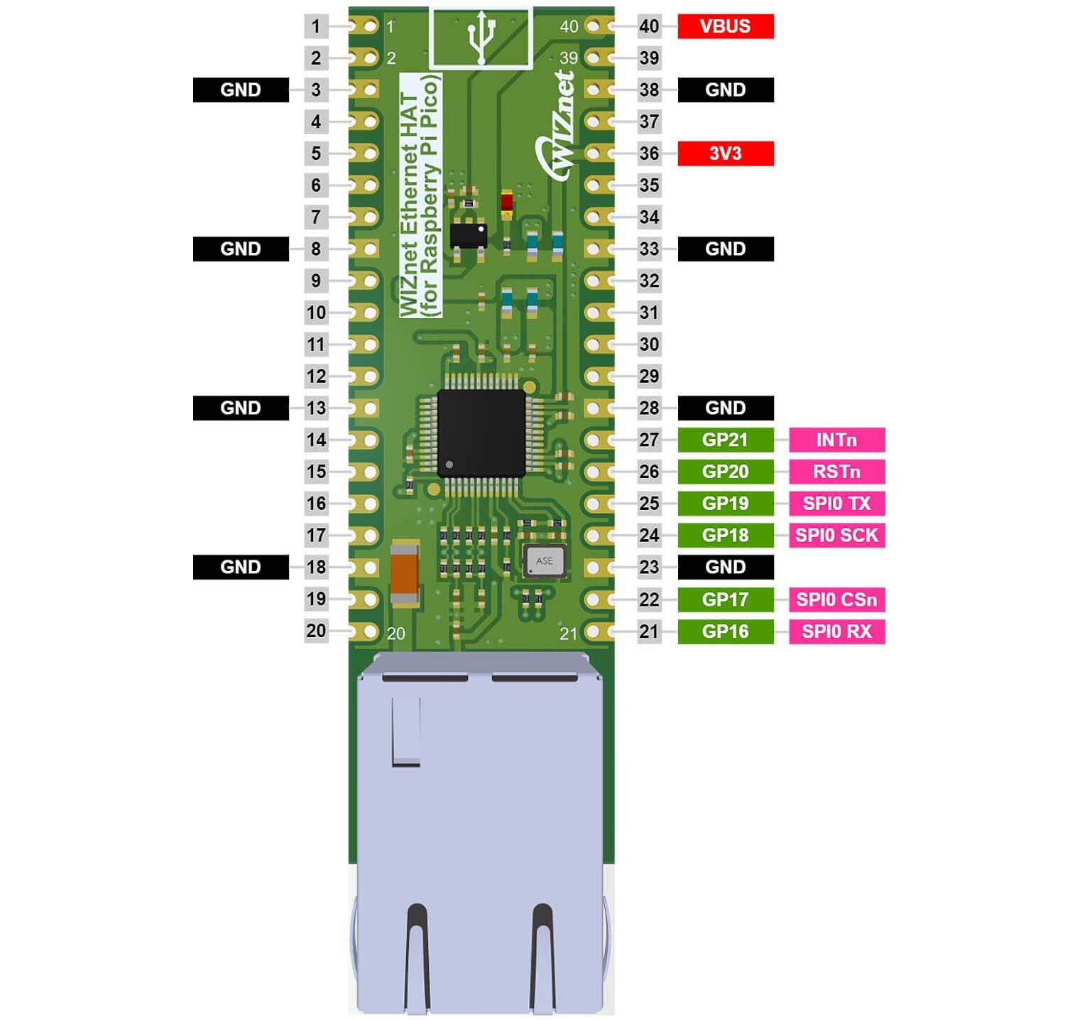 The WIZnet Ethernet HAT is a Raspberry Pi Pico add-on board that utilizes the W5100S embedded internet controller chip to provide an Ethernet connection to your Raspberry Pi Pico via SPI.
