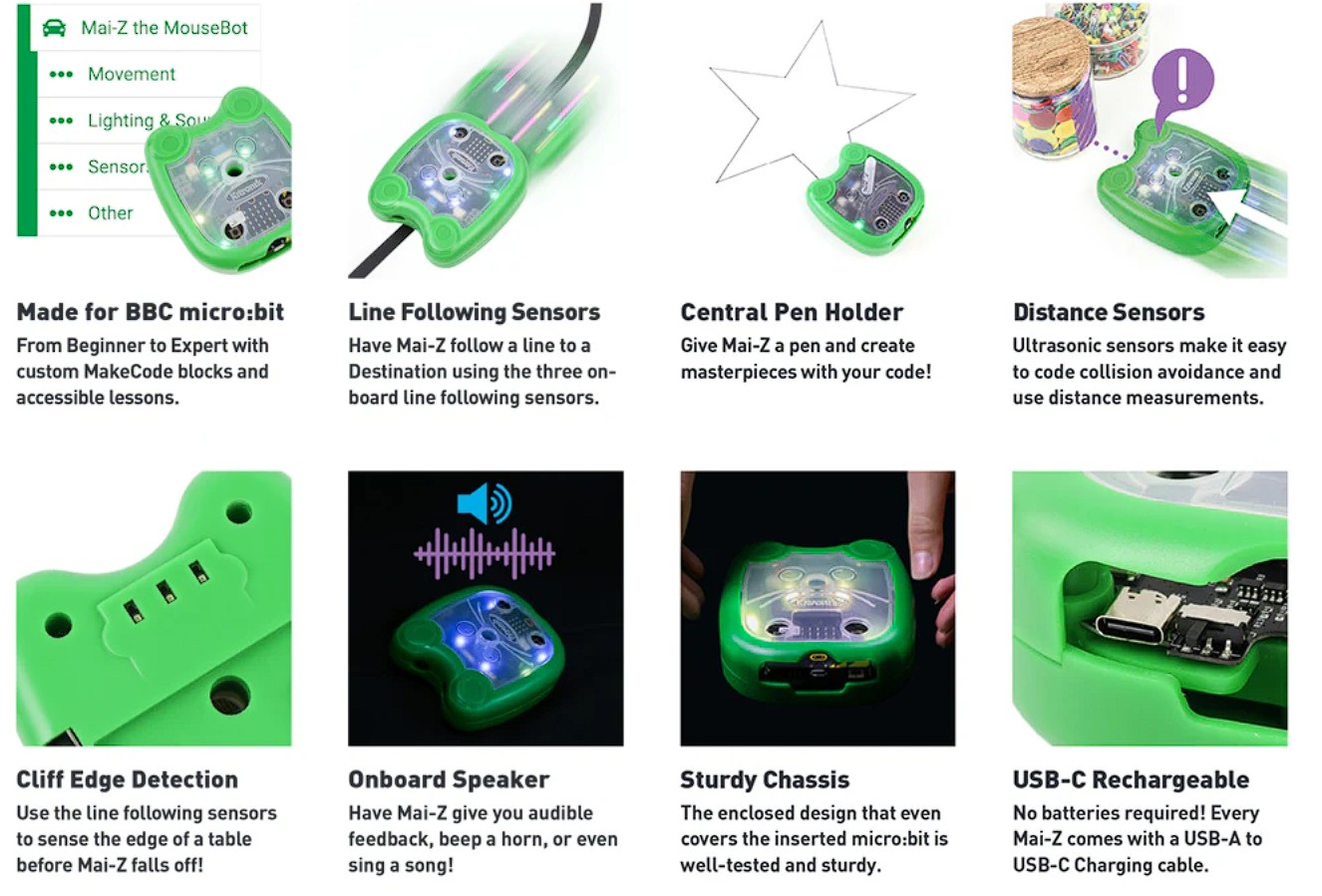 - Make full use of your micro:bit’s built-in tech. From accelerometer-based steering to compass-guided driving, Mai-Z makes robotics interactive and exciting.