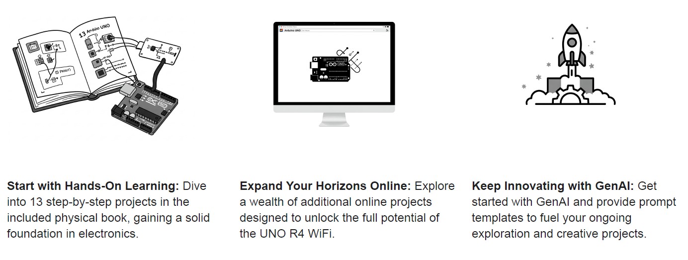 Discover exciting new online projects which explore the possibilities the UNO R4 WiFi's enhanced features bring, including capacitive sensing, mouse/keyboard simulation, and an onboard LED matrix. New projects coming on regular bases (3 months).