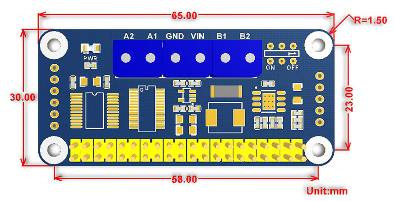 - Onboard PCA9685 chip, provides 12-bit hardware PWM to adjust motor speed
